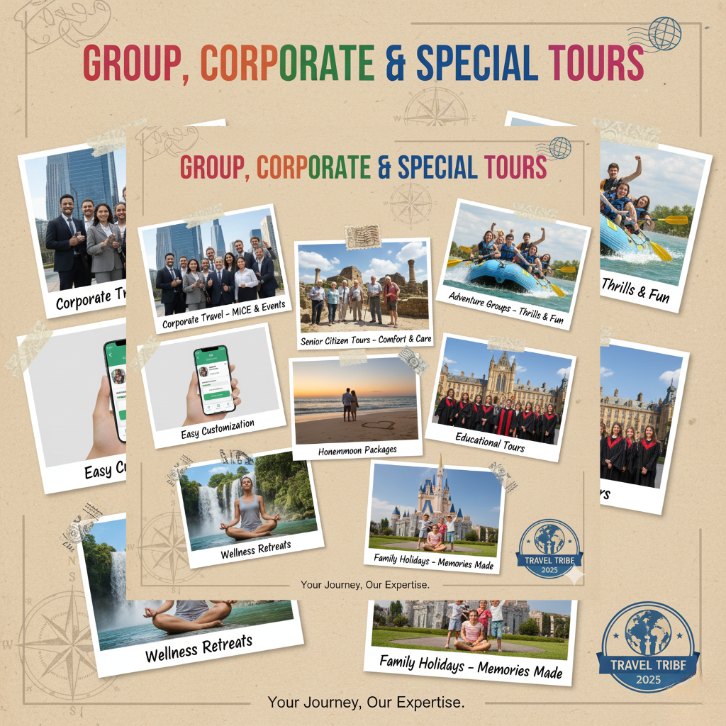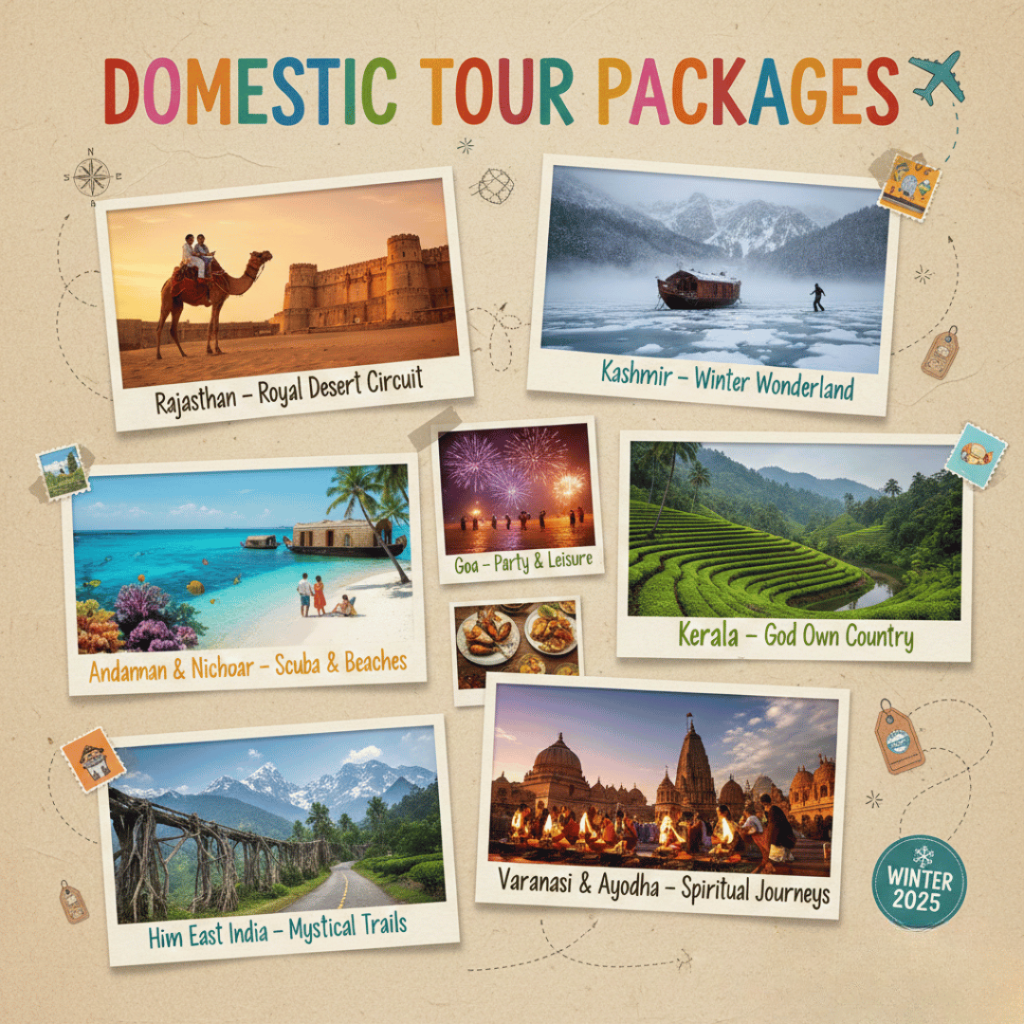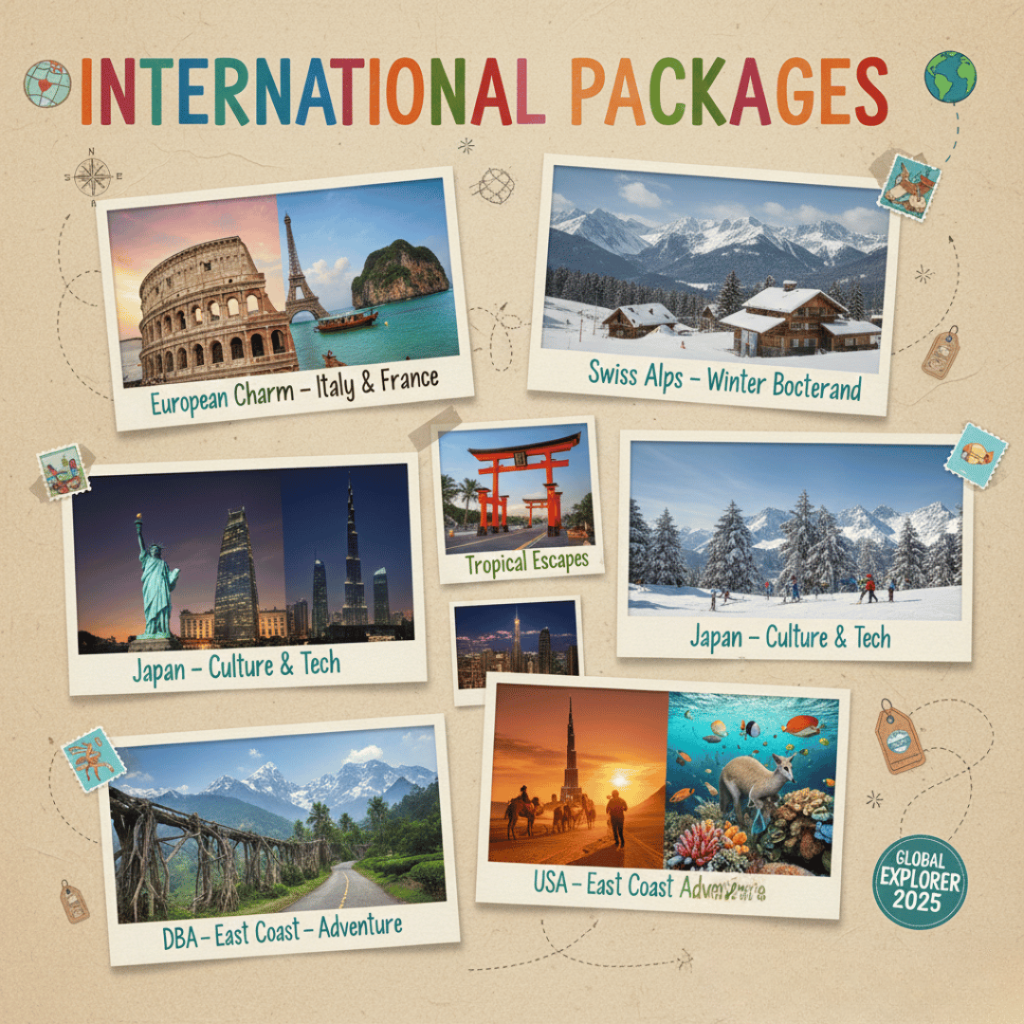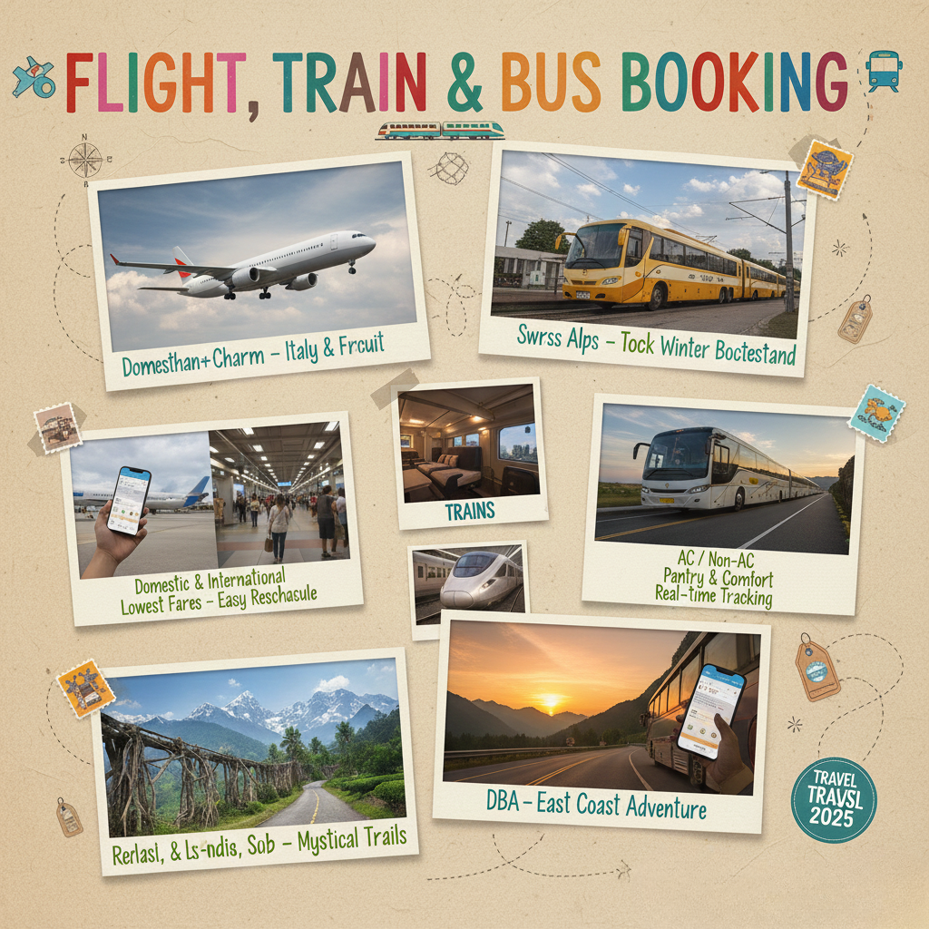 Table of Contents Toggle Our ServicesWe offer complete travel solutions designed to make your journey smooth, comfortable, and enjoyable.1. Domestic Tour Packages2. International Tour Packages3. Flight, Train & Bus Booking4. Hotel & Resort Booking5. Visa Assistance & Travel Insurance6. Car Rentals & Local Transport7. Group, Corporate & Special Tours8. Customized Travel Planning Our Services We offer complete travel solutions designed to make your journey smooth, comfortable, and enjoyable. 1. Domestic Tour Packages Explore the beauty of India with customized packages: ManaliShimlaGoaKerala RajasthanKashmirSouth India Temples Contact 2. International Tour Packages Travel worldwide with affordable packages for: Dubai Singapore Thailand Bali Maldives Europe USA / UK Contact 3. Flight, Train & Bus Booking Best flight deals IRCTC train bookings Luxury & sleeper bus tickets Contact 4. Hotel & Resort Booking Budget stays 3/4/5-star hotels Luxury resorts & villas Family-friendly & honeymoon stays Contact 5. Visa Assistance & Travel Insurance Visa documentation support Guidance for all major countries Overseas travel insurance Contact 6. Car Rentals & Local Transport Sedan, SUV, Tempo Traveller Airport pickup & drop Taxi services for sightseeing Contact 7. Group, Corporate & Special Tours Corporate travel planning School/college tours Family group trips Senior citizen tours Adventurous trips & treks Contact 8. Customized Travel Planning Tailor-made itineraries based on your: Budget Travel dates Preferences Group size Contact